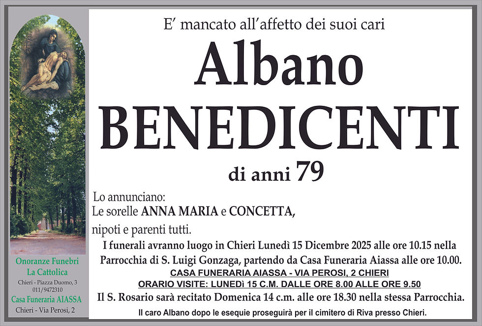 E' mancato all'affetto dei suoi cari Albano BENEDICENTI La Cattolica11 dic 2025Tempo di lettura: 0 min